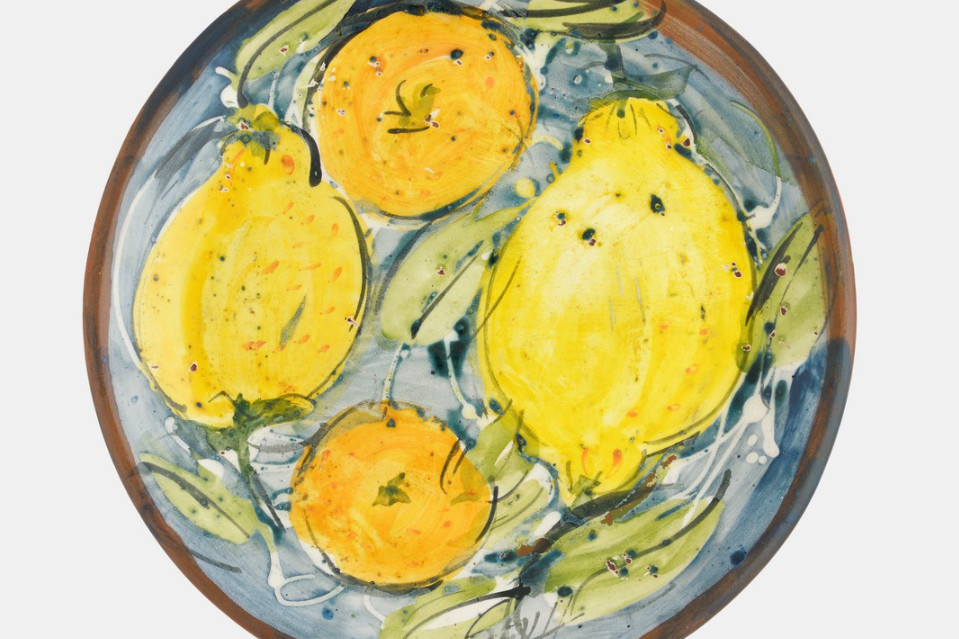 Δουλεύοντας με κόκκινο μπατανισμένο πηλό, κερί και φαγιάνς, η Ελένη συνθέτει ένα οργιαστικό ανοιξιάτικο σκηνικό στη βιτρίνα της Κριεζώτου 3. Ζωγραφίζει με πυροχρώματα, ελεύθερα, αβίαστα. Τριαντάφυλλα, παπαρούνες και λεμόνια μπλέκουν με φυλλώματα πάνω στον πηλό, σε διαρκώς επαναλαμβανόμενα μοτίβα, που προσδίδουν στη δουλειά της μια αυτόματη γραφή απολύτως αναγνωρίσιμη.