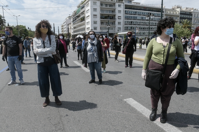 Μεγάλη συγκέντρωση καλλιτεχνών στην πλατεία Συντάγματος. Μουσικοί, ηθοποιοί, εικαστικοί, χορευτές, λογοτέχνες και άλλοι εργαζόμενοι στον χώρο του πολιτισμού τηρώντας αποστάσεις ασφαλείας ζητούν τη στήριξή τους.