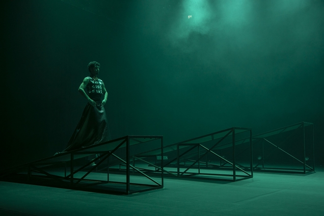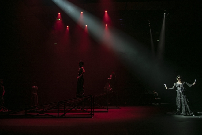 Απέναντι στις τρεις ράμπες, με ένα πιάνο (και έναν πιανίστα, τον Φώτη Λάμαρη) για συντροφιά, στέκεται η υποβλητική φιγούρα της Λυδίας Κονιόρδου. Ντυμένη με μια μαύρη μάξι τουαλέτα, με γενναιόδωρο ντεκολτέ-χαμόγελο και εντυπωσιακή, ημιάκαμπτη μακριά «ουρά», η μεγάλη ηθοποιός υποδύεται κάτι σαν τον πανθ’ ορόντα θάνατο –το καρμικό επιστέγασμα στις ζωές των τεσσάρων άλλων προσώπων του έργου. Ή, όπως το περιγράφει ο σκηνοθέτης της παράστασης, Κωνσταντίνος Χατζής, «Η Λυδία είναι ο μαύρος άγγελος. Ή ο θάνατος. Που τ’ αγκαλιάζει όλα, που λέει τις ιστορίες [των τεσσάρων άλλων] και είναι λίγο πιο πάνω από αυτούς.»