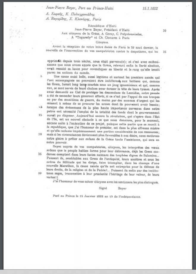 Έψαξα να βρω την επίσημη αϊτινή πλευρά επί του θέματος. Πώς μνημονεύεται, αν μνημονεύεται, σήμερα όλη αυτή η ιστορικά καταγεγραμμένη αλληλεγγύη τους προς την Ελλάδα της εθνεγερσίας; Πλην όμως, ο επίτιμος πρόξενος της Δημοκρατίας της Αϊτής στην Αθήνα, ο ορθοπεδικός χειρούργος Ιβέλτ Λεμπρέν, είχε πρόσφατα αποβιώσει, όπως με πληροφόρησε η χήρα του, Αικατερίνη. Η ίδια, ωστόσο, με μεγάλη ευγένεια ψυχής, αναφέρθηκε στις προσπάθειες και του ίδιου του μακαρίτη συζύγου της για την ανάδειξη της επιστολής Μπουαγιέ, αλλά και του βαθύτερου συμβολισμού αυτής της τολμηρής πολιτικής απόφασης εκ μέρους της «μικρής» Αϊτής. Η κα. Λεμπρέν μού έστειλε επίσης την σελίδα από τον Δ’ Τόμο της «Αλληλογραφίας» του Κοραή, με την ιστορική επιστολή του αϊτινού προέδρου –θερμές ευχαριστίες.