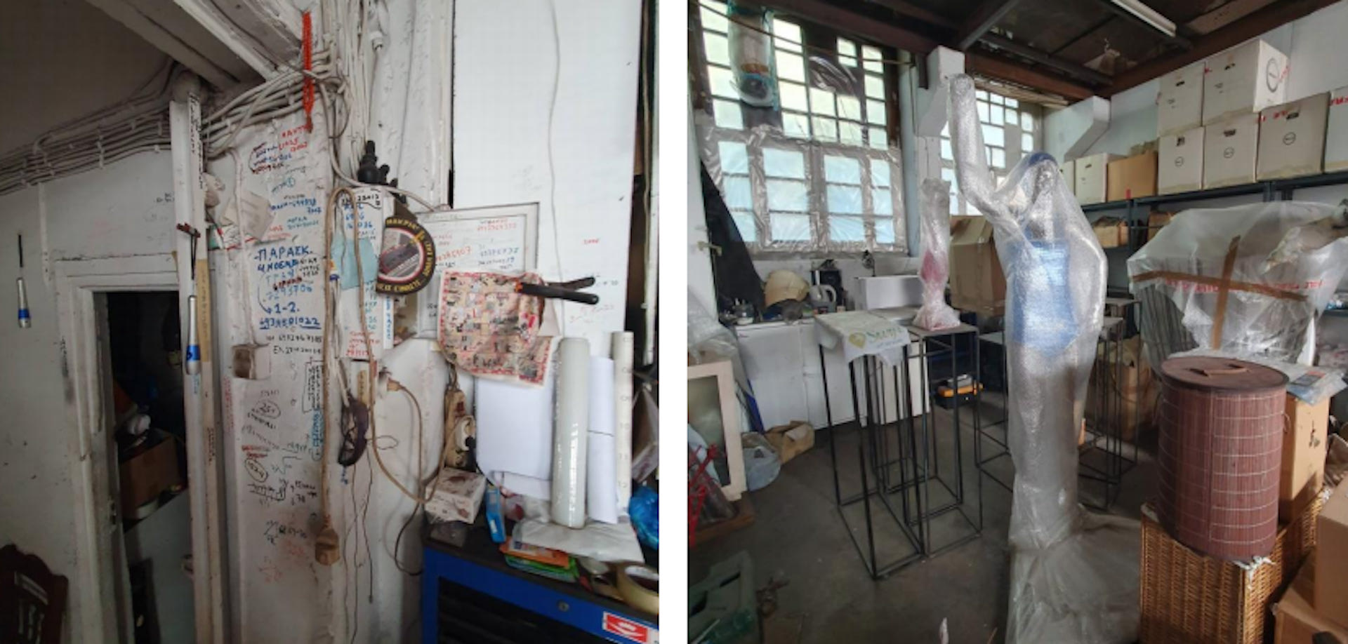 α) Δύο αίθουσες εργαστηρίου γλυπτικής στο ισόγειο και στο υπόγειο. Στη στάθμη του ισογείου, αναπτύσσεται η μεγάλη αίθουσα εργαστηρίου γλυπτικής. Πρόκειται για μια ενιαία αίθουσα, επιφάνειας 413 τ.μ. Στη στάθμη του υπογείου βρίσκεται, επίσης, ένας ενιαίος μικρότερος διαμήκης χώρος, ο οποίος έχει εμβαδόν 236 τ.μ. Σήμερα έχει χρήση αποθήκης, αρχείου υλικών και γλυπτών.