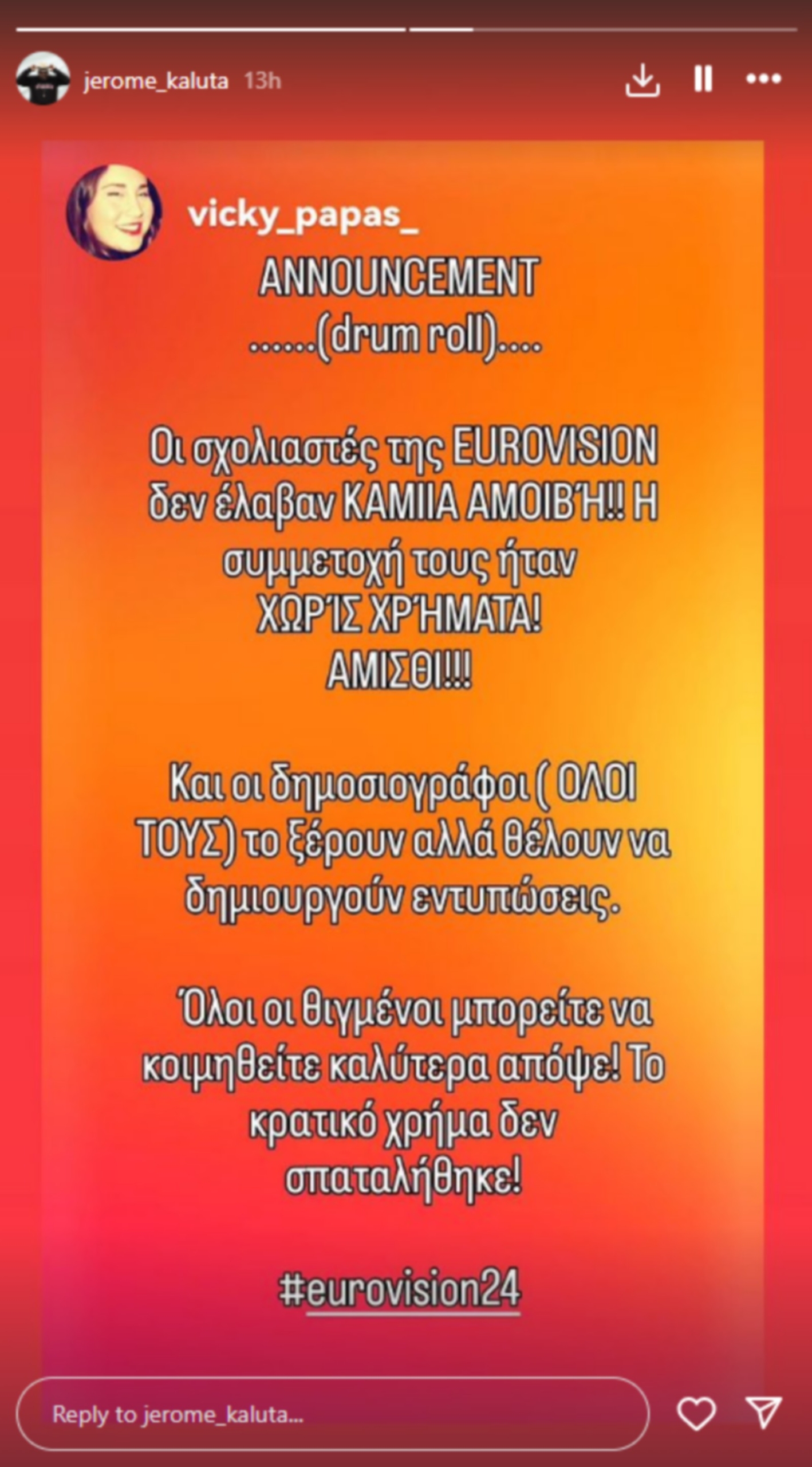 “Ανακοίνωση! Οι σχολιαστές της Eurovision δεν έλαβαν καμία αμοιβή!! Η συμμετοχή τους ήταν χωρίς χρήματα αμισθί!!!”, αναφέρει το story συνεργάτιδάς του που αναδημοσίευσε ο ίδιος, στο οποίο αναφέρεται επίσης πως αυτό το γνωρίζουν όλοι οι δημοσιογράφοι “αλλά θέλουν να δημιουργούν εντυπώσεις. Όλοι οι θιγμένοι μπορείτε να κοιμηθείτε καλύτερα απόψε! Το κρατικό χρήμα δεν σπαταλήθηκε!”.