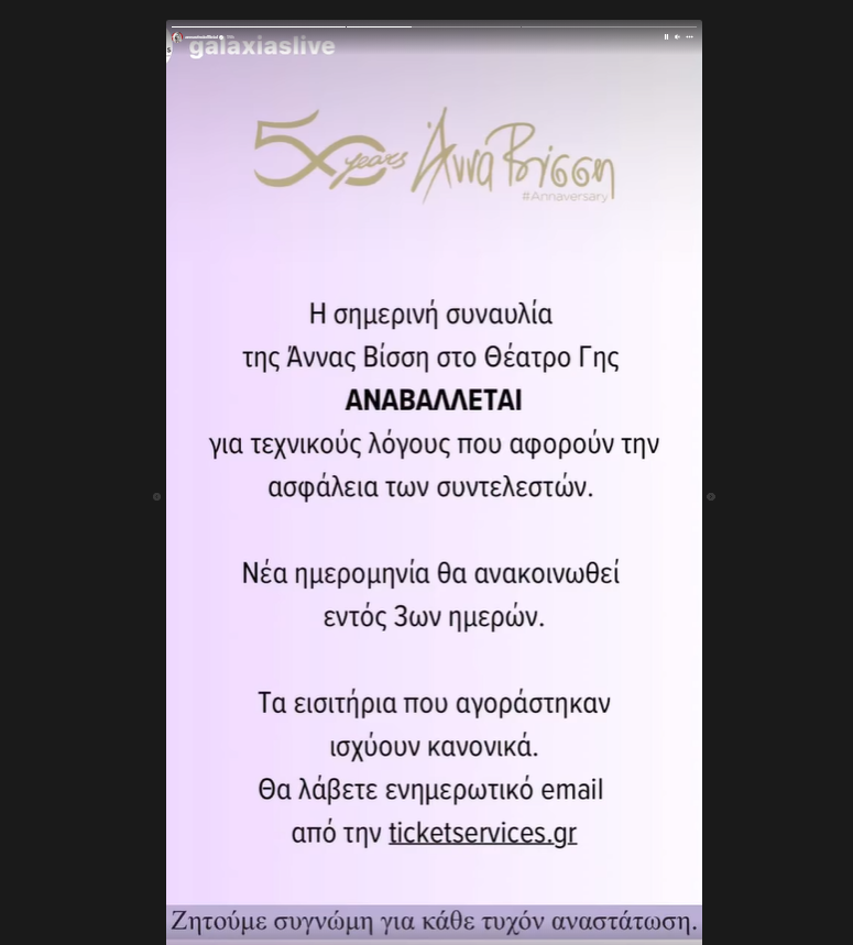 Η τραγουδίστρια περίπου στις 18:30, το απόγευμα της Δευτέρας, αναδημοσίευσε στα κοινωνικά της δίκτυα την έκτακτη ανακοίνωση σύμφωνα με την οποία η συναυλία της «50 χρόνια Άννα Βίσση» δεν θα πραγματοποιηθεί για τεχνικούς λόγους.