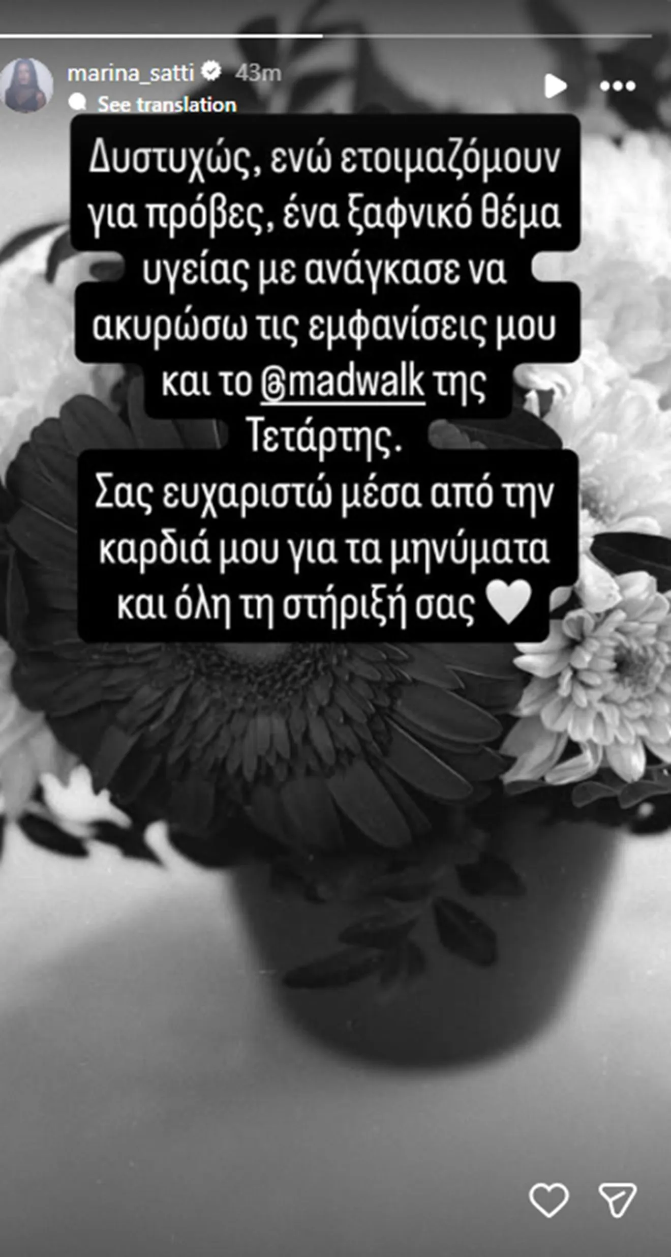 Ακολούθως, ανάρτηση έκανε στα social media και η Μαρίνα Σάττι, γράφοντας: «Δυστυχώς, ενώ ετοιμαζόμουν για πρόβες, ένα ξαφνικό θέμα υγείας με ανάγκασε να ακυρώσω τις εμφανίσεις μου και το MadWalk 2025 της Τετάρτης.