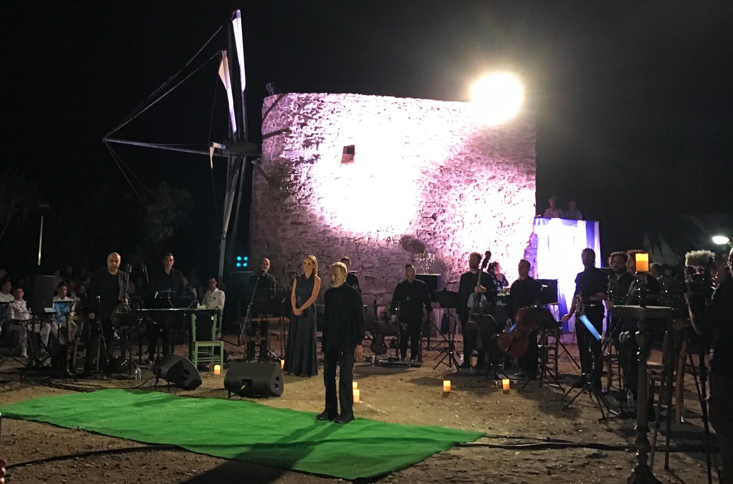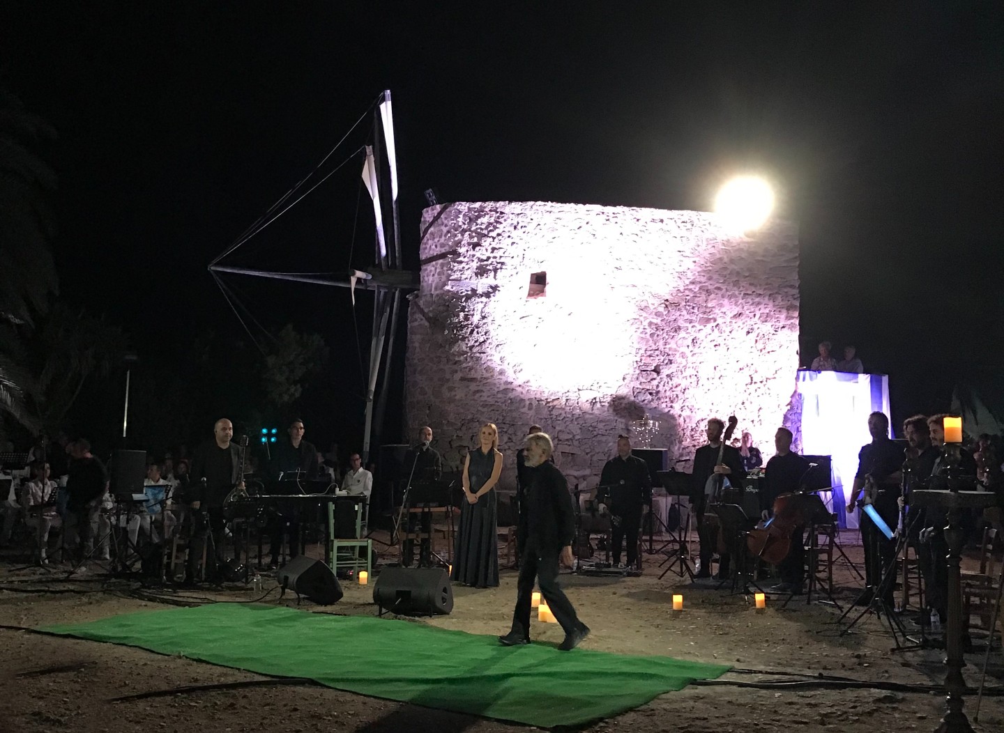 Μία λιτή και απέριττη “σκηνή” οριοθετήθηκε πάνω στο χώμα, μπροστά από τον επιβλητικό ανεμόμυλο, που δεσπόζει στον περίβολο του πιο ξακουστού μοναστηριού της Κρήτης. Εδώ δεν χωρούν φαντεζί σκηνικά, visuals ή οτιδήποτε περιττό για απλό εντυπωσιασμό. Μόνο μερικά κεριά, η μουσική και η ελληνική σημαία. Αυτό το αφαιρετικό σκηνικό, εκεί όπου ο κόσμος μπορούσε να ανασάνει παράλληλα με την ορχήστρα και σχεδόν να αγγίξει τον μεγάλο Έλληνα δημιουργό, απεδείχθη η απόλυτα ιδανική συνθήκη για να να “συναντηθούμε” με τις μουσικές του.