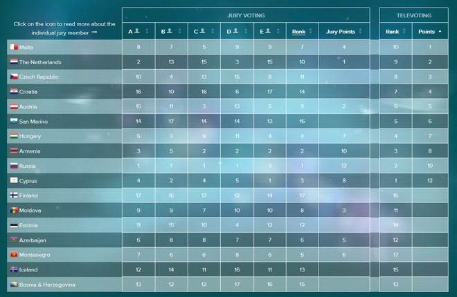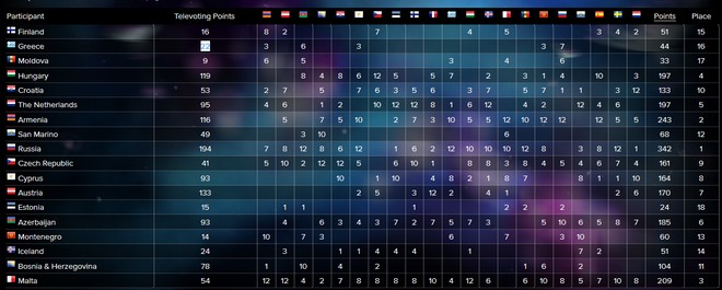 Τρεις βαθμούς μας έδωσε η Αρμενία, έξι το Αζερμπαϊτζάν, τρεις η Κύπρος, τρεις το Μαυροβούνιο και εφτά η Ρωσία, ήτοι 22 βαθμούς στο σύνολο από τις Επιτροπές.