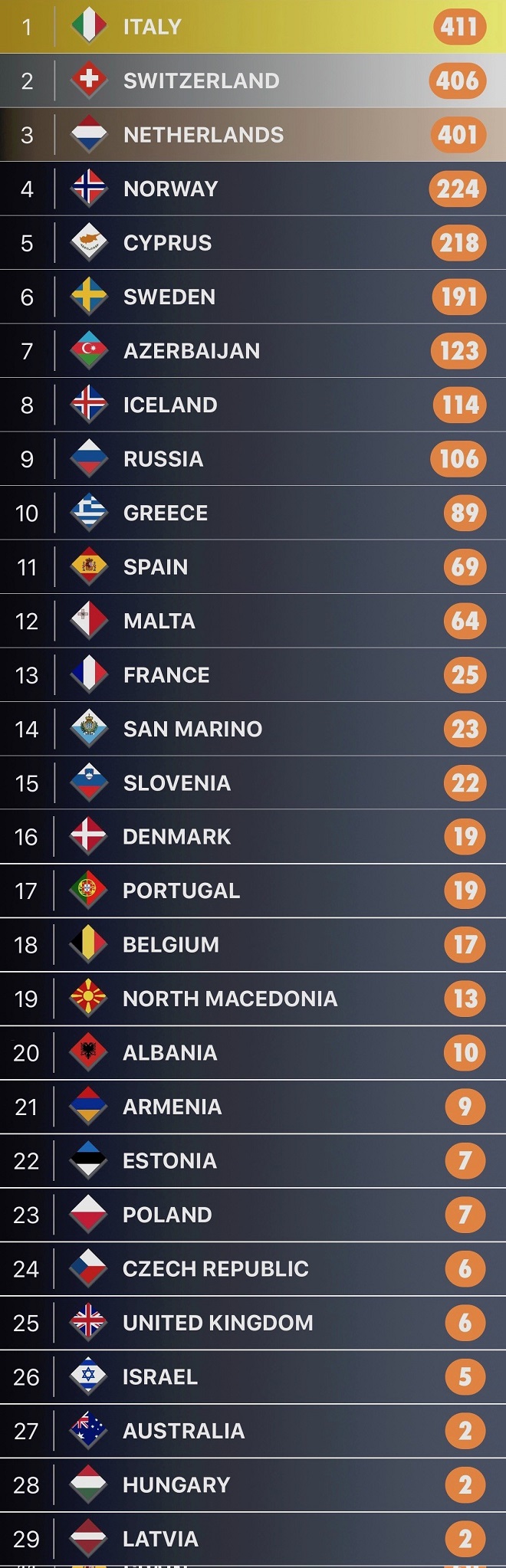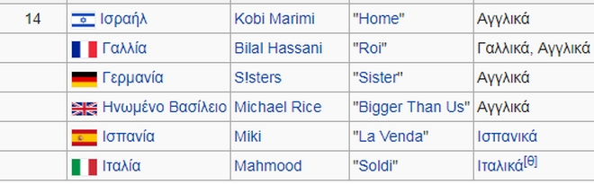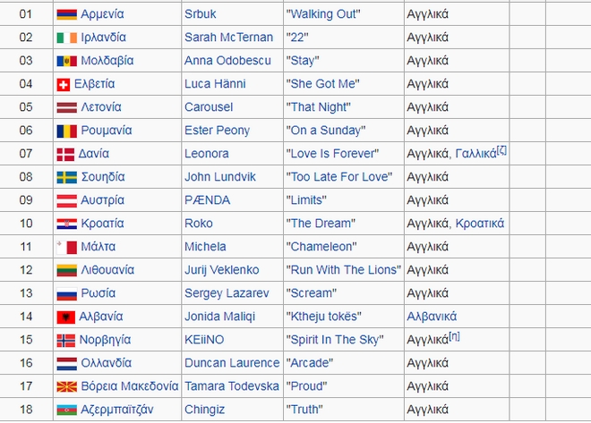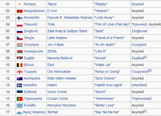 Αναλυτικά οι χώρες και τα τραγούδια τους: