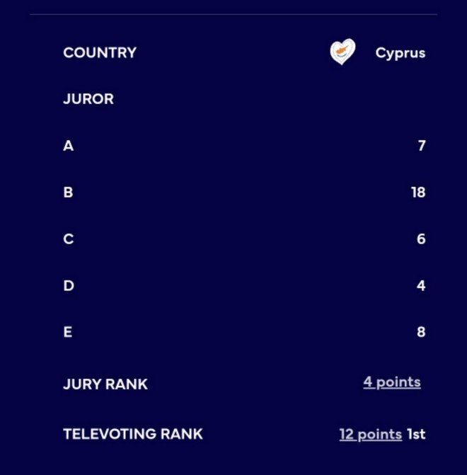 Όπως βλέπουμε, 4 από τους 5 κριτές της ελληνικής επιτροπής έδωσαν βαθμούς στο κομμάτι της Κύπρου. Συγκεκριμένα, ένας κριτής κατέταξε το τραγούδι στην 7η θέση, ένας στην 6η, ένας στην 4η θέση και ένας στην 8η.
