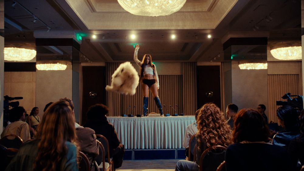Το σκηνικό, μια –βαρετή– συνέντευξη Τύπου, ώσπου μια αποστροφή του λόγου της, σε έναν συμβολισμό αίματος, ξυπνά το ενδιαφέρον και έτσι προσφέρεται τροφή για τα θηρία σε ένα πεινασμένο ακροατήριο.