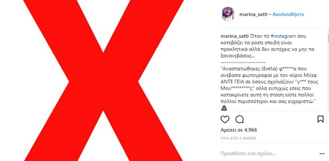 Εν συνεχεία δέχθηκε επιθετικά ρατσιστικά σχόλια στο προφίλ της, με αποτέλεσμα να απαντήσει: “Αναστατώθηκες (διπλά) φ*****α που ανέβασα φωτογραφία με τον κύριο Mirza; ΑΝΤΕ ΓΕΙΑ σε όσους σχολιάζουν “γ*** τους Μου*********ς” αλλά ευτυχώς εσείς που κατακρίνετε αυτή τη στάση είστε πολλοί πολλοί περισσότεροι και σας ευχαριστώ”.