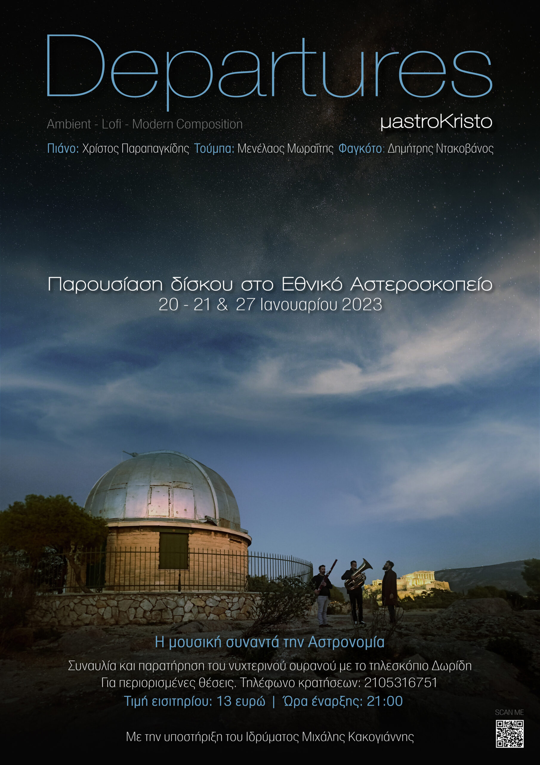 Για την παρουσίαση της μουσικής του σε ένα τοπόσημο όπως το Αστεροσκοπείο μας λέει: “Η παρουσίαση του Departures θα πραγματοποιηθεί στο Εθνικό Αστεροσκοπείο με τελικό προορισμό της εκδήλωσης, τις αναχωρήσεις στο παρελθόν μέσω της ξενάγησης στο νυχτερινό ουρανό και την παρατήρηση των πλανητών με το εμβληματικό τηλεσκόπιο Δωρίδη.