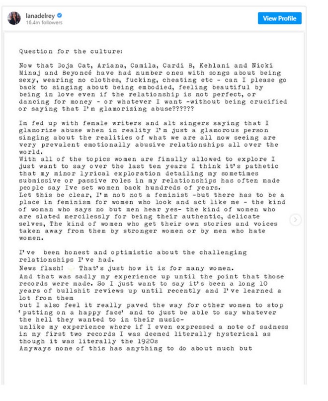 Η γνωστή τραγουδίστρια Lana Del Rey, μέσω δημοσίευσης στο Instagram ανακοίνωσε την κυκλοφορία του νέου της άλμπουμ, ενώ παράλληλα εξαπέλυσε επίθεση προς όσους την κατηγορούν πως “έχει πάει τις γυναίκες εκατοντάδες χρόνια πίσω”.