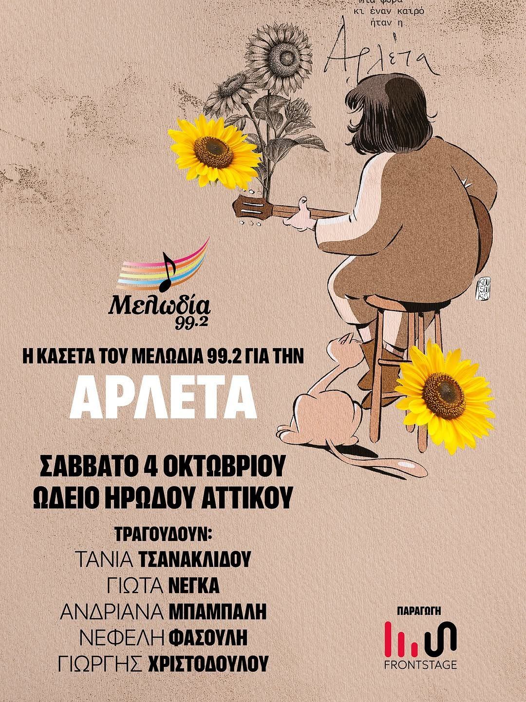 Η Κασέτα του Μελωδία 99.2 για την Αρλέτα θα είναι μια μουσική περιπλάνηση στη μαγεία του προσωπικού κόσμου της Αρλέτας, όπως εκείνη την εμπνεύστηκε και την τραγούδησε, μέσα από τις μοναδικές ερμηνείες της Τάνιας Τσανακλίδου, της Γιώτας Νέγκας, της Ανδριάνας Μπάμπαλη, της Νεφέλης Φασούλη και του Γιώργη Χριστοδούλου. Το υπέροχο σκίτσο της αφίσας είναι του Σταύρου Κιουτσούκη.