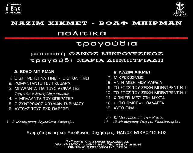 Στα ποιήματα του Μπίρμαν η μετάφραση έγινε από τον Δημοσθένη Κούρτοβικ, ενώ εκείνα του Χικμέτ απέδωσαν ο Γιάννης Ρίτσος και ο Γιώργος Παπαλεονάρδος. Η μελοποίηση τους έγινε από τον Θ. Μικρούτσικο την περίοδο της Χούντας, όταν και δεν μπορούσε να τα κυκλοφορήσει.