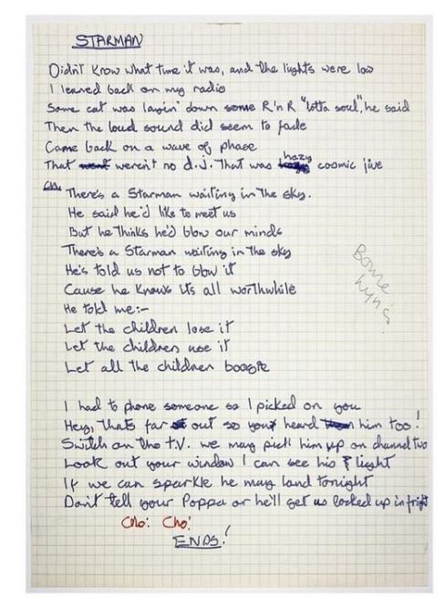 Σε ένα χαρτάκι έγραψε… τους στίχους του τραγουδιού Starman το 1972. Το χειρόγραφο του David Bowie, όπου με τον γραφικό του χαρακτήρα αποτυπώθηκαν τα λόγια του βασικού κομματιού από το άλμπουμ “The Rise and Fall of Ziggy Stardust and the Spiders from Mars”, πουλήθηκε σε δημοπρασία.