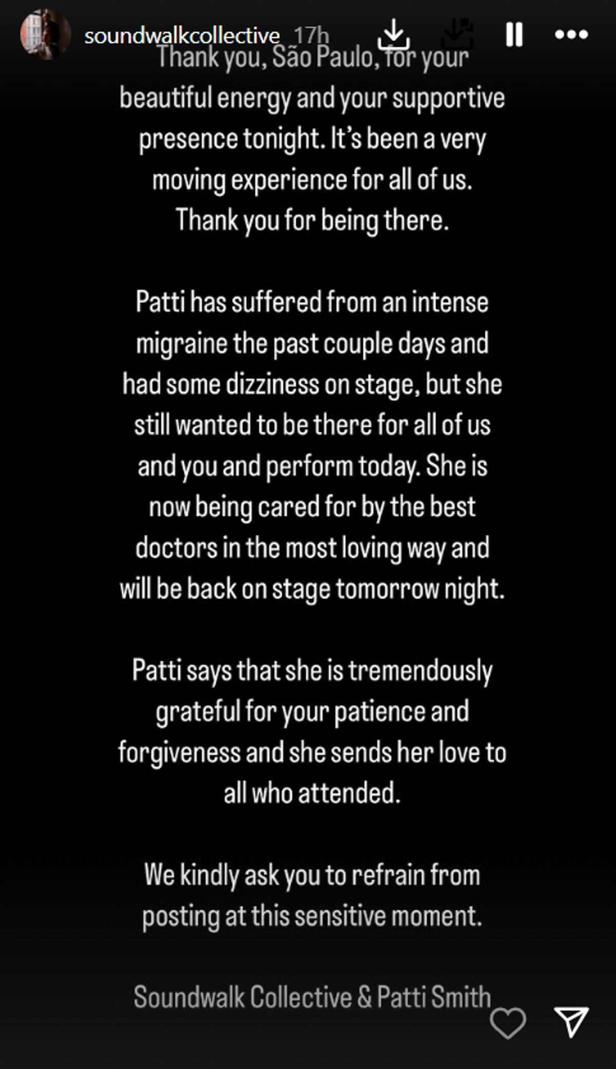 Η ανακοίνωση, την οποία υπογράφει και η ίδια η Πάτι Σμιθ, κλείνει αναφέροντας πως “η Πάτι εκφράζει την τεράστια ευγνωμοσύνη της για την υπομονή και τη συγχώρεσή σας και στέλνει την αγάπη της σε όλους όσοι παρακολούθησαν την εμφάνιση”.