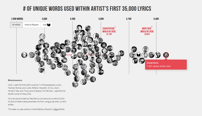 Λαμβάνοντας αφορμή από το έργο και τη λεξιπλαστική ικανότητα του Ουίλιαμ Σαίξπηρ, ο γραφίστας και στατιστικολόγος Matt Daniels έφτιαξε ένα απίστευτο Infographic αποτυπώνοντας το λεξιλόγιο διάσημων Αμερικάνων MCs σε αριθμούς βάσει πρωτοτυπίας λεξιλογίου που χρησιμοποιείται από αυτούς.