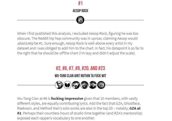 Πρώτος στη λίστα φιγουράρει ο ράπερ Aesop Rock με 7,392 μοναδικές λέξεις, ενώ ο ίδιος ο Σαίξπιρ δεν μπαίνει καν στην πρώτη δεκάδα. Ο Melville με το Moby Dick βρίσκεται μέσα στις πρώτες θέσεις με πάνω από 6,000 μοναδικές λέξεις.