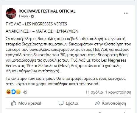 Με μία ανακοίνωση στον επίσημο λογαριασμό του Rockwave Festival στο Facebook πληροφορηθήκαμε ότι οι συναυλίες των Πυξ Λαξ στην Τεχνόπολη Δήμου Αθηναίων στις 19 Ιουλίου και των Les Negresses Vertes στις 20 Ιουλίου στη Μονή Λαζαριστών, ματαιώνονται. Ο λόγος σύμφωνα με την ανακοίνωση σχετίζεται με ζητήματα διαχείρισης πνευματικών δικαιωμάτων, τα οποία φέρνουν νομικά εμπόδια στο συγκρότημα των Πυξ Λαξ που θα έπαιζε γνωστές επιτυχίες της δεκαετίας του ’90.