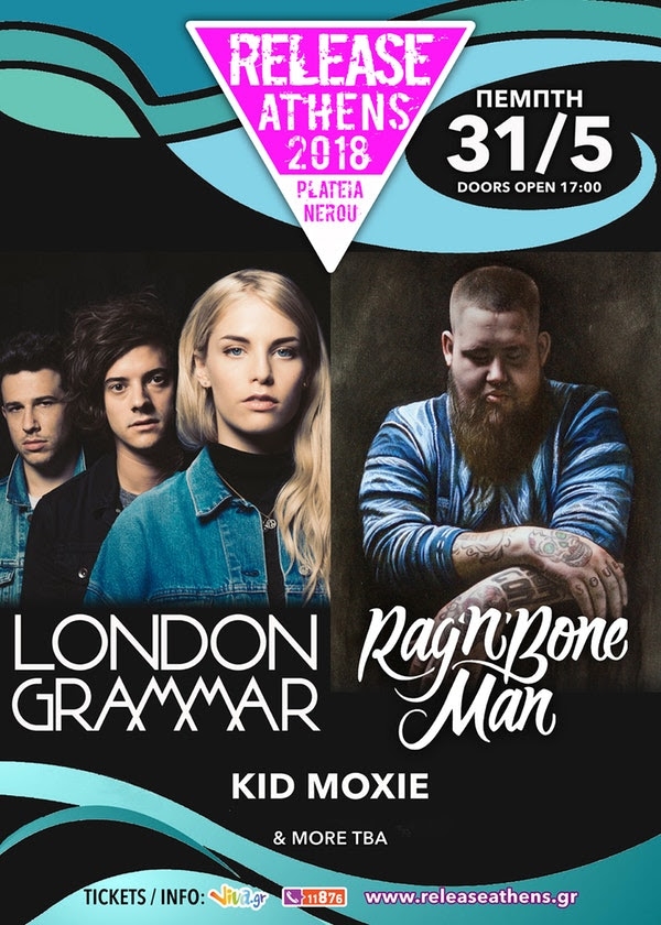 Οι εκπληκτικοί London Grammar, με τη μαγευτική Hannah Reid στα φωνητικά, και ο επιβλητικός Rag’n’Bone Man , ο άνθρωπος που με το “Human” δημιούργησε το μεγαλύτερο hit των δύο τελευταίων ετών , θα εμφανιστούν ως headliners , για πρώτη φορά, στη χώρα μας, την πρώτη ημέρα του Release Athens 2018 . Δύο από τα μεγαλύτερα νέα ονόματα του Βρετανικού αλλά και του παγκόσμιου στερεώματος,που σαρώνουν πωλήσεις και βραβεία, αποτελώντας σημείο αναφοράς όχι μόνο για το παρόν αλλά και για το μέλλον της σύγχρονης pop σκηνής.