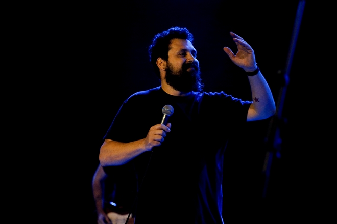 “Συναυλία; Συνάθροιση; Συναστρία; Αστροπελέκι; Αν είναι δέντρο χωρίς κορμό μήπως είναι ιπτάμενος θάμνος; Συναυλία, ένας άνθρωπος μπροστά σε μικρόφωνο. Το μικρόφωνο ανοίγει, είναι συνδεδεμένο με την κονσόλα… ευτυχώς. Ο Σπύρος Γραμμένος είναι ο καλλιτέχνης της επαναστατημένης νεολαίας. Των προέφηβων ψαράδων που αγαπούν το καλάμι, αλλά σιχαίνονται το σκουλήκι. Των μετανοημένων ψηφοφόρων του Πέτρου Τατούλη.