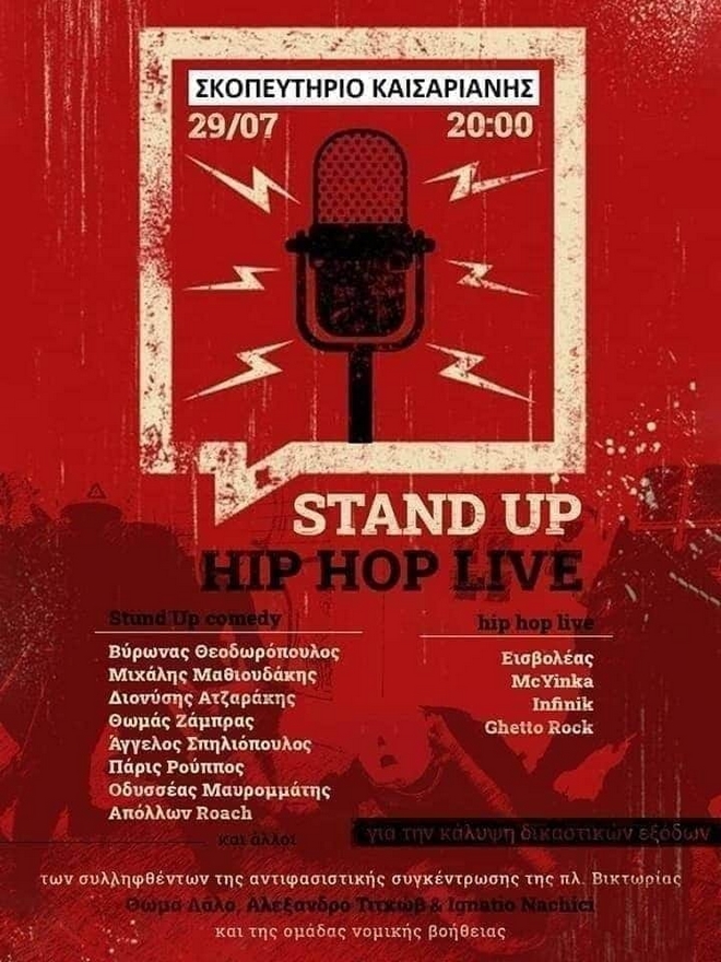 Stand Up και Hip Hop Live αλληλεγγύης θα διεξαχθεί την Τετάρτη 29 Ιουλίου στο Σκοπευτήριο της Καισαριανής με αφορμή τον ξυλοδαρμό και τη σύλληψη Τιτκώβ και Λάλου σε πορεία στήριξης μεταναστών στην πλατεία Βικτωρίας.