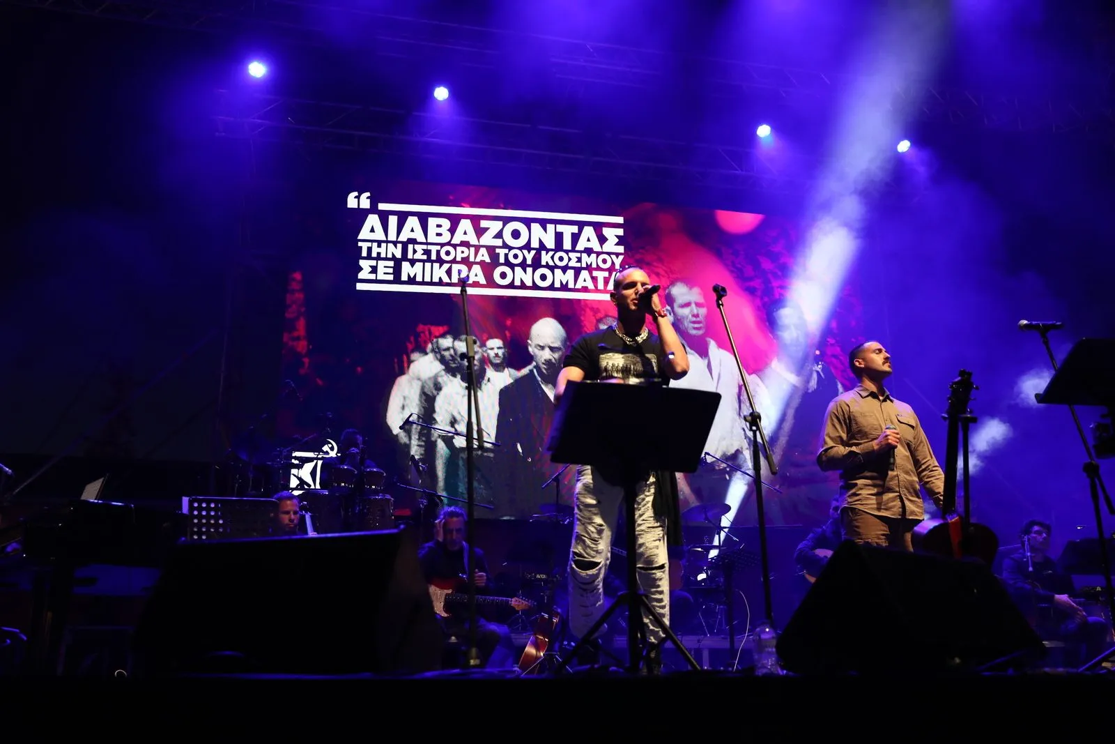 Στο τέλος, όλοι μαζί στη σκηνή. Τα «Μαλαματένια λόγια» – ένα τραγούδι που κουβαλά μέσα στους στίχους του μια ολόκληρη εποχή – έφερε όλους τους καλλιτέχνες στη σκηνή. Το κοινό όρθιο, γροθιές ψηλά, μια ενέργεια που ξεπερνά το ίδιο το γεγονός.