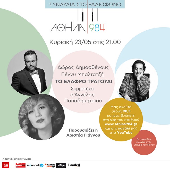 Την Κυριακή, 23 Μαΐου, μπείτε στο YouTube κανάλι του Αθήνα 9,84 ή στο site του και συντονιστείτε στη συχνότητα των 98,3 για να απολαύσετε τραγούδια πολύ γνωστά και αγαπητά από όλη τη γκάμα του παλιού, ελαφρού ελληνικού τραγουδιού, όπως τα «Τι είναι αυτό που το λένε αγάπη», «Ζητάτε να σας πω», «Πάμε στο άγνωστο», «Λίγες καρδιές αγαπούνε», «Παπαρούνα», «Χαρά μου», «Από μέσα πεθαμένος» , «Άστο το χεράκι σου» , «Ταμπακιέρα», «Πόσο λυπάμαι», «Θα σε πάρω να φύγουμε» και πολλά άλλα.