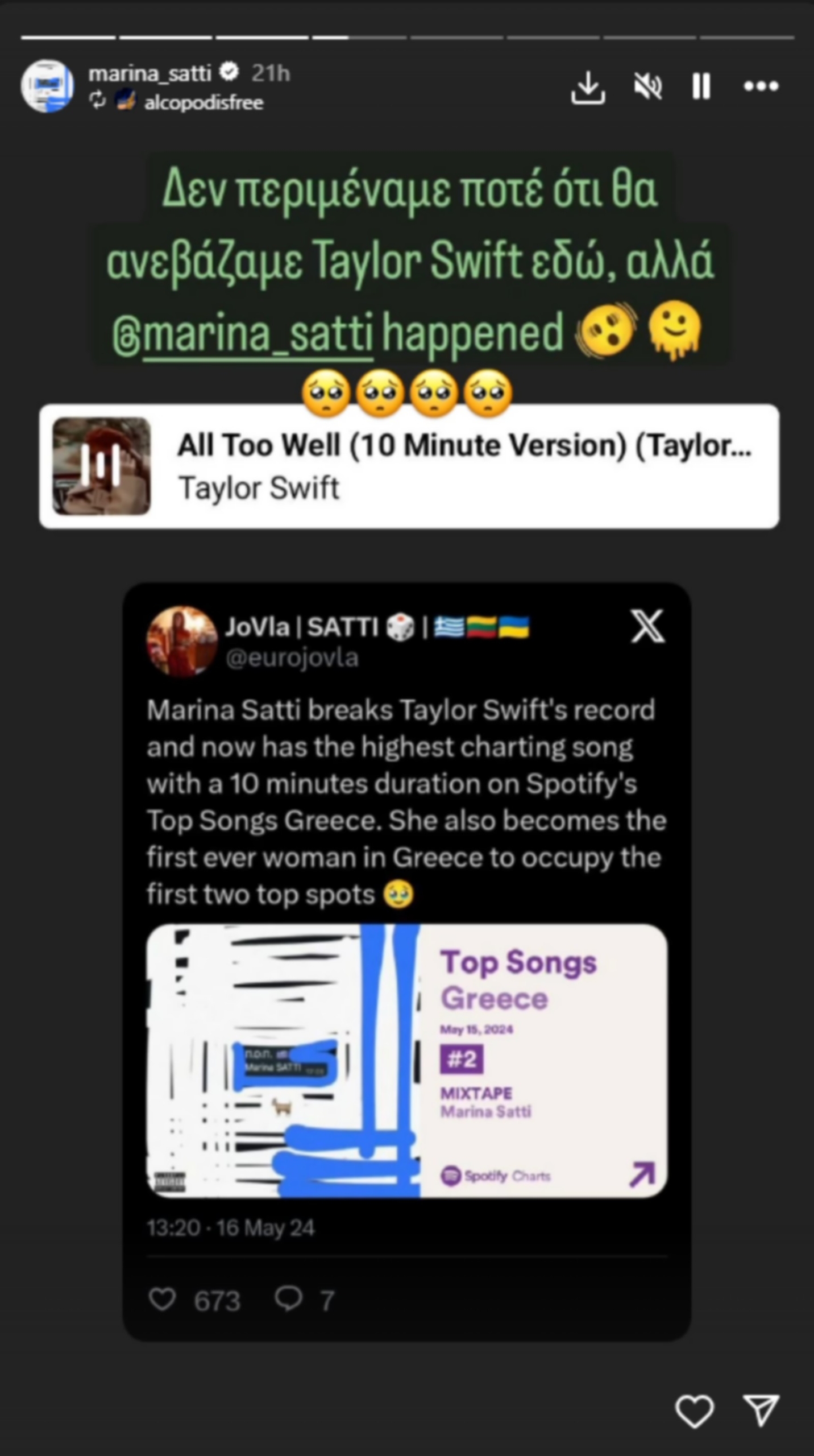Όπως φαίνεται στην ανάρτηση που αναδημοσίευσε η Μαρίνα Σάττι, το κομμάτι “MIXTAPE” είναι το τραγούδι με διάρκεια 10 λεπτών με την υψηλότερη κατάταξη στα Top Songs του Spotify στην Ελλάδα, περνώντας τη δεκάλεπτη version του “All Too Well” της Σουίφτ.
