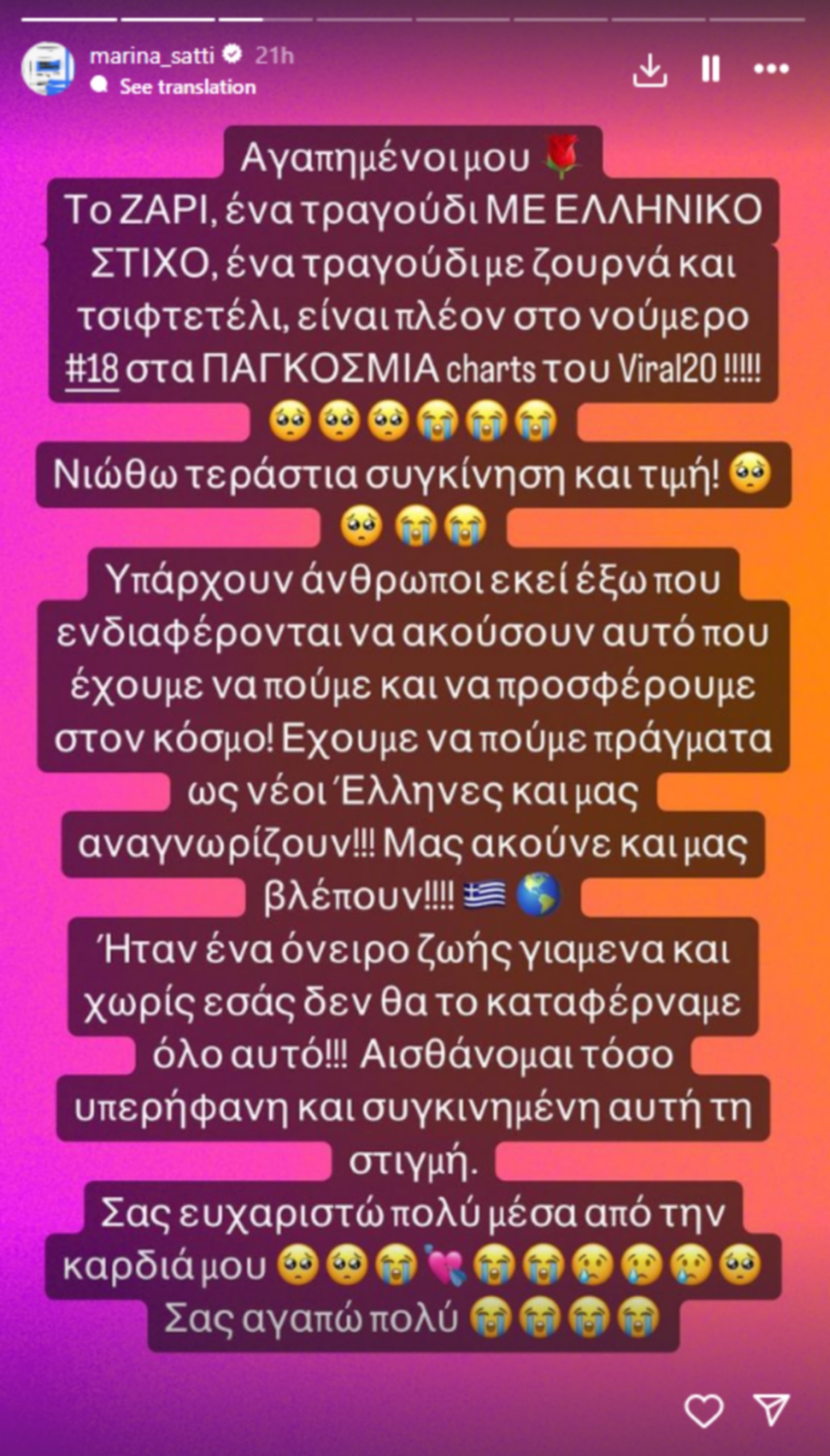 “Αγαπημένοι μου. Το ZAΡΙ είναι ένα τραγούδι με ΕΛΛΗΝΙΚΟ ΣΤΙΧΟ, ένα τραγούδι με ζουρνά και τσιφτετέλι, είναι πλέον στο νούμερο 18 στα παγκόσμια charts του Viral 20! Νιώθω τεράστια συγκίνηση και τιμή! Υπάρχουν άνθρωποι εκεί έξω που ενδιαφέρονται να ακούσουν αυτό που έχουμε να πούμε και να προσφέρουμε στον κόσμο! Έχουμε να πούμε πράγματα ως νέοι Έλληνες και μας αναγνωρίζουν!!! Μας ακούνε και μας βλέπουν!!!!