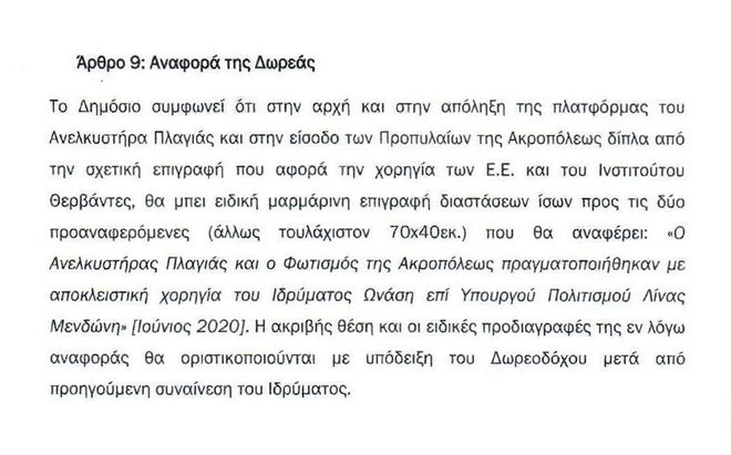 Αυτή δεν είναι μία σύμβαση με την υπογραφή μου: στο πιο πρόσφατο επεισόδιο…εικονικής πραγματικότητας, η Λίνα Μενδώνη κατηγόρησε την Αντιπολίτευση για fake news και “δολοφονία χαρακτήρος” επειδή η “Αυγή” αποκάλυψε πρώτη πώς στην επίσημη σύμβαση δωρεάς που υπογράφτηκε μεταξύ του Δημοσίου, του Ιδρύματος Ωνάση και της εταιρείας «Αριόνα» για τη χορηγία κατασκευής του ανελκυστήρα, του καινούριου φωτισμού της Ακρόπολης και της πραγματοποίησης των (επιστημονικά αμφιλεγόμενων) διαστρώσεων με οπλισμένο σκυρόδεμα, το άρθρο 9 προέβλεπε την τοποθέτηση μαρμάρινης επιγραφής στην αρχή και την απόληξη της πλατφόρμας του ανελκυστήρα πλαγιάς και στην είσοδο των Προπυλαίων, στην οποία θα αναγράφεται πως : “Ο ανελκυστήρας πλαγιάς και ο φωτισμός της Ακροπόλεως πραγματοποιήθηκαν με αποκλειστική χορηγία του Ιδρύματος Ωνάση επί υπουργού Πολιτισμού Λίνας Μενδώνη (Ιούνιος 2020)”. Χθες το μεσημέρι εστάλη η ανακοίνωση του ΥΠΠΟ με δύο φωτογραφίες επιγραφών απ΄όπου λείπει πράγματι το όνομα της κας Μενδώνη. Πλην όμως ήταν η ίδια που κατέθεσε στη Βουλή τη σύμβαση και η δική της υπογραφή, μαζί με του υπουργού Οικονομικών Χρήστου Σταϊκούρα και του υφυπουργού Οικονομικών Απόστολου Βεσυρόπουλου που την κύρωνε εκ μέρους του Δημοσίου. Το χειρότερο; Όλοι είδαμε το άρθρο 9 και τις υπογραφές στις φωτογραφίες από τη σύμβαση που επισύναπτε το ρεπορτάζ.
