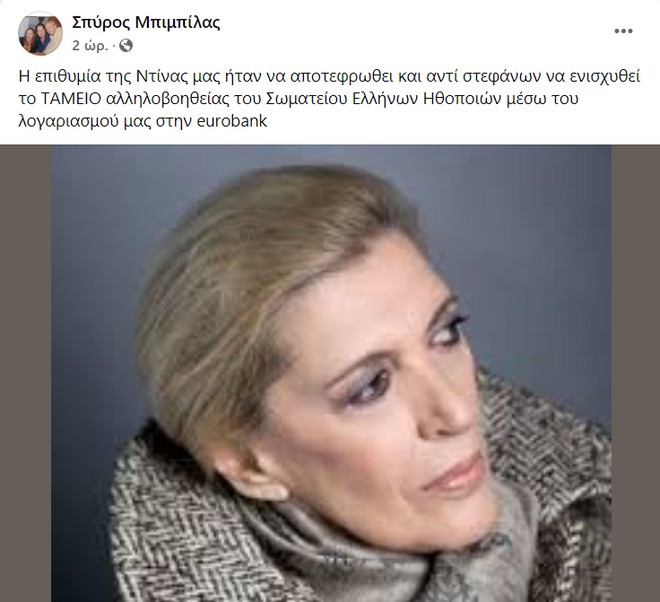 Παράλληλα, επιθυμία της ήταν αντί στεφάνων να ενισχυθεί το Ταμείο Αλληλοβοηθείας του Σωματείου Ελλήνων Ηθοποιών (ΤΑ.ΣΕ.Η.) μέσω του τραπεζικού λογαριασμού που διαθέτει.