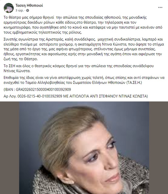 Θλίψη σκόρπισε στον καλλιτεχνικό χώρο και στο ευρύ κοινό ο θάνατος της αγαπημένης ηθοποιού Ντίνας Κώνστα, η οποία έφυγε από τη ζωή την Κυριακή (03/07) σε ηλικία 83 ετών.