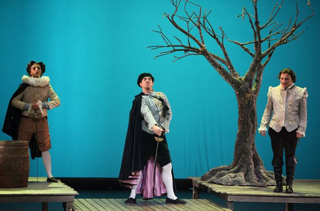 Αλλά ας πάρουμε τα πράγματα από την αρχή: Καλό είναι όποιος πάει στην παράσταση να αφήσει πίσω τους τις μνήμες της ταινίας. Και αυτό γιατί το φιλμ γυρίστηκε πριν από 21 χρόνια και προσπάθησε να αποδώσει με μια σύγχρονη – για την εποχή – ματιά την Ελισαβετιανή Αγγλία, με την ανάλογη προφορά, άρθρωση, ατμόσφαιρα… Η παράσταση έχει ένα δικό της ρυθμό, πιο γρήγορο και εκ των πραγμάτων πιο άμεσο, δεδομένου ότι οι ηθοποιοί έχουν σκηνοθετηθεί να στέκονται αντικριστά με τους θεατές, και να “παίζουν” μαζί τους (ειδικά στη σκηνή με το “θέατρο μέσα στο θέατρο”).