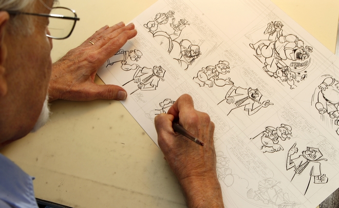 Ο σκιτσογράφος Hy Eisman δουλεύει πάνω στα σχέδια της σειράς κινουμένων σχεδίων του Ποπάυ ⓒ 2021 Mel Evans / Associated Press
