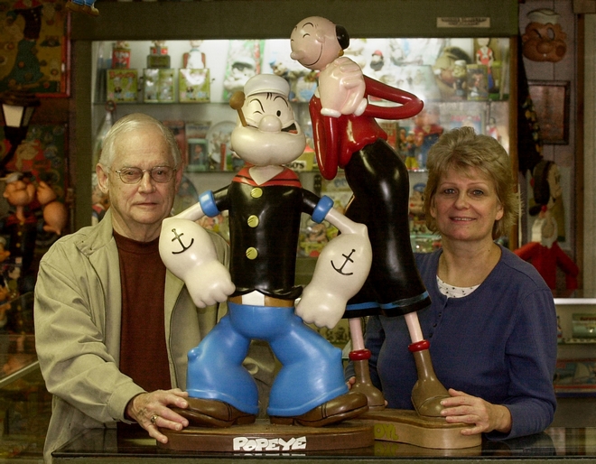 Ernie Schuchert, left, nephew to J. William Schuchert, the inspiration for Wimpy, a character from the Popeye comic strip, and Laurie Randall, right, co-owner of Spinach Can Collectibles and the Popeye Museum, pose inside the museum in downtown Chester, Ill., Wednesday, Jan. 14, 2004. Saturday, Jan. 17, is the 75th anniversary of Popeye the Sailor Man's comic-strip debut. (AP Photo/Charles Rex Arbogast) @2021 Charles Rex Arbogast /Associated Press