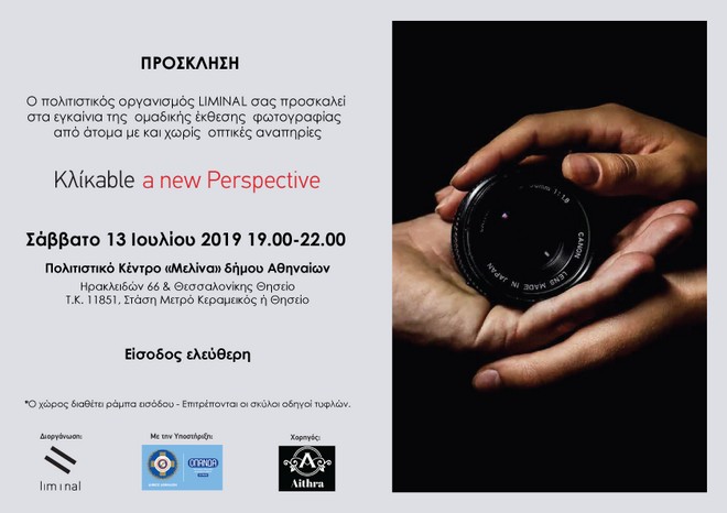 Επαγγελματίες και ερασιτέχνες φωτογράφοι με και χωρίς οπτικές αναπηρίες παρουσιάζουν τα έργα τους σε μια ξεχωριστή έκθεση που τιτλοφορείται “Kλίκable_a new perspective”και θα πραγματοποιηθεί στο Πολιτιστικό Κέντρο «Μελίνα» δήμου Αθηναίων από τις 13 έως και τις 19 Ιουλίου. Επιστέγασμα του εκπαιδευτικού προγράμματος Κλικ-able Project – Εξοικείωση με την τέχνη της φωτογραφίας για άτομα με οπτική αναπηρία, η μοναδική αυτή έκθεση σκοπό έχει να αποδείξει με τον πιο εύλογο τρόπο ότι τέχνη και δημιουργία έχουν την ικανότητα να ξεπερνούν οποιοδήποτε φυσικό ή κοινωνικό χαρακτηριστικό. Ξεφεύγοντας από τα “στενά” όρια της όρασης, η τέχνη της φωτογραφίας, μπλέκεται με τις άλλες αισθήσεις όπως την ακοή, την αφή, την όσφρηση….Με αυτόν τον τρόπο επαναπροσδιορίζεται μέσα από μια νέα οπτική και ανοίγει καινούργιους δρόμους δημιουργίας και αντίληψης.