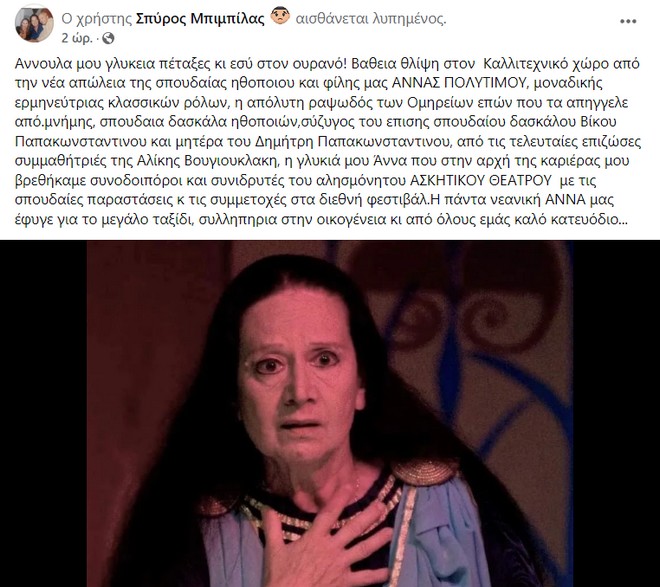 Αννούλα μου γλυκιά πέταξες κι εσύ στον ουρανό! Βαθιά θλίψη στον Καλλιτεχνικό χώρο από την νέα απώλεια της σπουδαίας ηθοποιού και φίλης μας ΑΝΝΑΣ ΠΟΛΥΤΙΜΟΥ, μοναδικής ερμηνεύτριας κλασσικών ρόλων, η απόλυτη ραψωδός των Ομηρικών επών που τα απήγγειλε από μνήμης, σπουδαία δασκάλα ηθοποιών, σύζυγος του επίσης σπουδαίου δασκάλου Βίκου Παπακωνσταντίνου και μητέρα του Δημήτρη Παπακωνσταντίνου, από τις τελευταίες επιζώσες συμμαθήτριές της Αλίκης Βουγιουκλάκη, η γλυκιά μου Άννα που στην αρχή της καριέρας μου βρεθήκαμε συνοδοιπόροι και συνιδρυτές του αλησμόνητου ΑΣΚΗΤΙΚΟΥ ΘΕΑΤΡΟΥ με τις σπουδαίες παραστάσεις κ τις συμμετοχές στα διεθνή φεστιβάλ. Η πάντα νεανική ΑΝΝΑ μας έφυγε για το μεγάλο ταξίδι, συλλυπητήρια στην οικογένεια κι από όλους εμάς καλό κατευόδιο”.