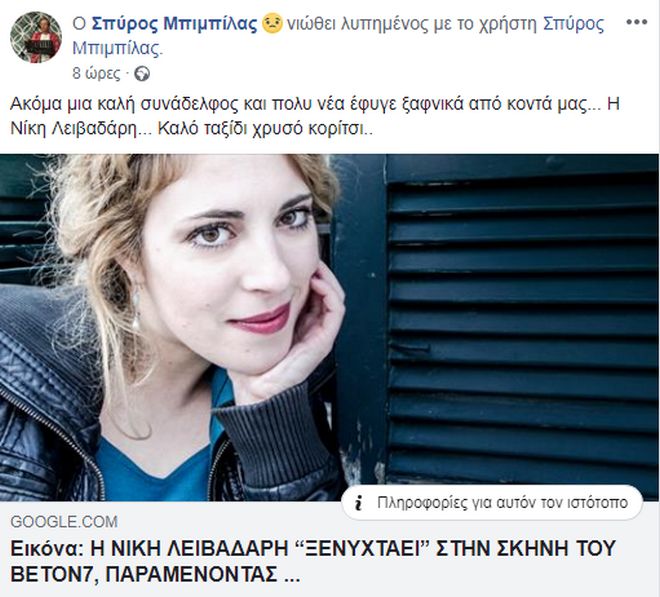 Τη θλιβερή είδηση δημοσιοποίησε ο γνωστός ηθοποιός και πρόεδρος του «ΤΑΣΕΗ» (Ταμείο Αλληλοβοήθειας Σωματείου Ελλήνων Ηθοποιών) Σπύρος Μπιμπίλας μέσα από τον προσωπικό του λογαριασμό στο Facebook.