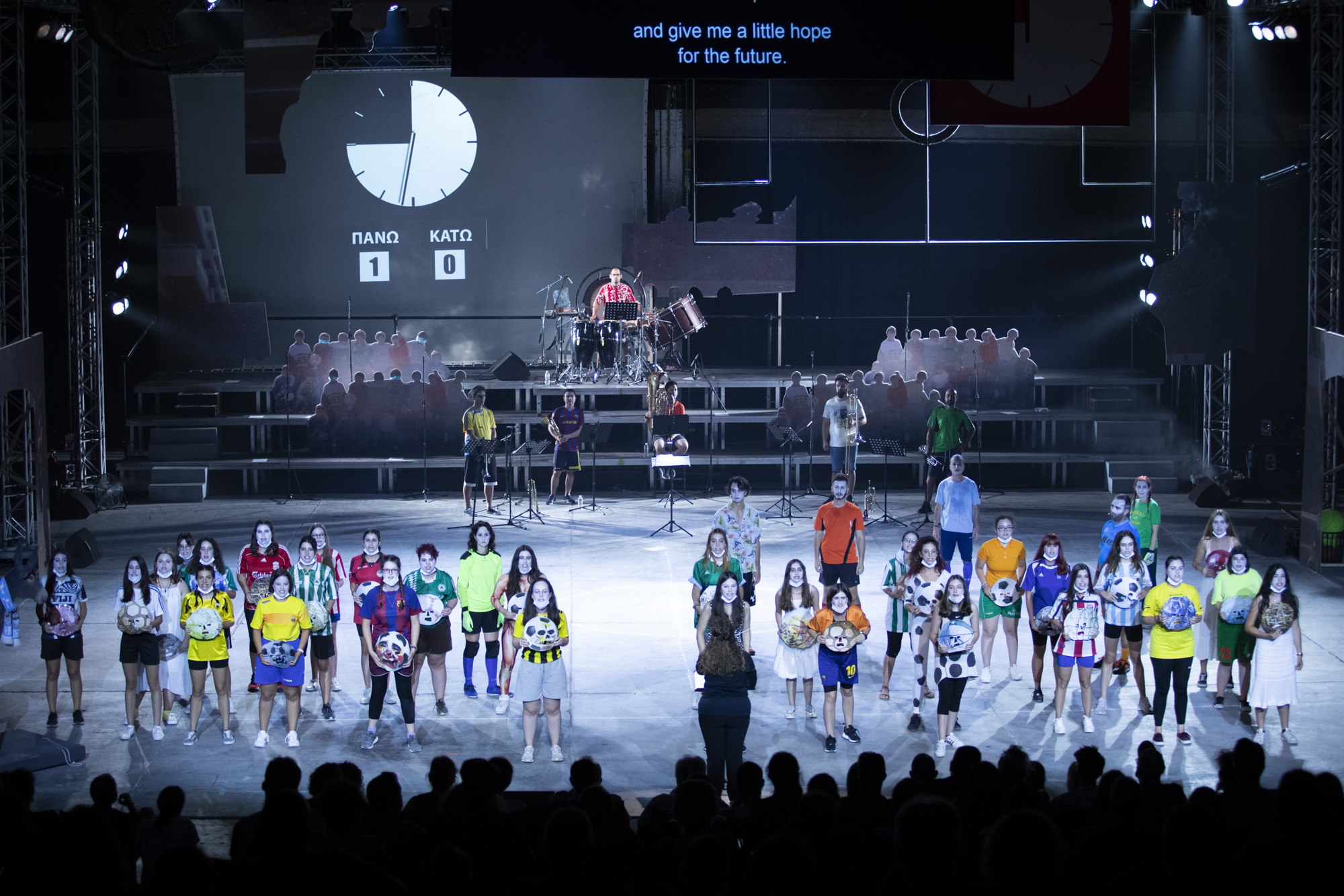 Αξιοζήλευτα, όλα αυτά, δεν χωράει αμφιβολία. Μα πώς στο καλό του ήρθε η ιδέα γι’ αυτό το πάντρεμα μπάλας και όπερας; «Χρόνια την έχω την ιδέα, από το 2003-2004. Έπαιζα πολλή μπάλα όταν ήμουν μικρός· και έκανα και μουσική με την μαμά, που είναι μουσικός, και ήταν δυο κόσμοι παράλληλοι που λειτουργούσαν μέσα μου. Κάποια στιγμή, όταν ήμουν φαντάρος… στην Χίο κάναμε μια συναυλία στις Οινούσσες, σε ένα γήπεδο που το ένα του πέταλο είναι θέατρο. Και μόλις μπήκα, μου ήρθε μια φλασιά: λέω, εδώ μπορεί να γίνει κάτι τρελό! Εκεί ήταν η πρώτη σύλληψη της ιδέας. Μετά, όταν πήγα στο Βερολίνο και άρχισα να μαθαίνω πώς μπορείς να φτιάξεις μια παράσταση σύγχρονου μουσικού θεάτρου, είδα σιγά-σιγά ότι όλα μπορούν να γίνουν. Ακριβώς επειδή το μουσικό θέατρο σου δίνει την δυνατότητα να σπας τις φόρμες, να δουλέψεις ως συνθέτης σε μια πιο ευρεία γκάμα, να παντρέψεις πράματα. Κάποια στιγμή, λοιπόν, ένιωσα ότι μπορεί να γίνει. Έφυγα, βέβαια, από την ουτοπία της αρχικής ιδέας –ότι θα είναι 11x11, ότι θα έχει ορχήστρα, ότι θα έχει μπάντα, ότι θα είναι γεμάτο φιλάθλους, ότι θα είναι πραγματικά ένας αγώνας. Δηλαδή, μπορεί κι αυτό κάποια στιγμή και να γίνει. Προσπάθησα να το μειώσω στο απολύτως δυνατό, οπότε, για να μπορούμε να τα διαχειριστούμε όλα καλύτερα, καταλήξαμε σε έναν αγώνα 3x3. Ούτε καν 5x5! [γέλια].»