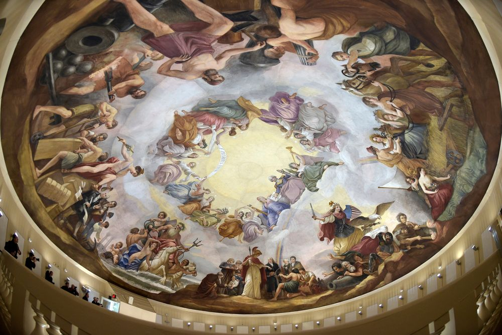 Οι εντυπωσιακές τοιχογραφίες που διακοσμούν τους τοίχους και τους θόλους του εσωτερικού του κτιρίου εντυπωσίασαν μεταξύ άλλων και τον Έλον Μασκ, τον οποίο έπιασαν οι φωτογράφοι να … αγναντεύει τον θόλο της αίθουσας με δέος.
