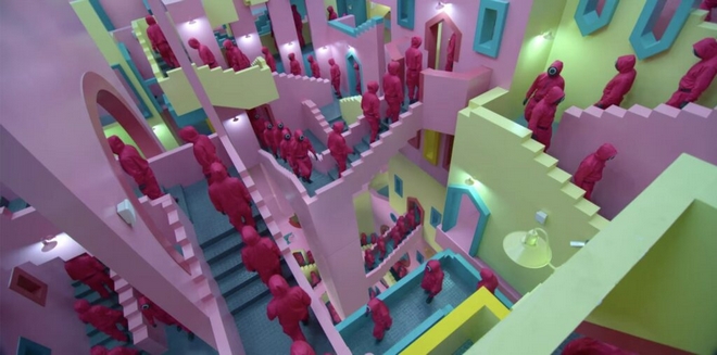 Τα χρώματα και η διακόσμηση της σκάλας στο Squid game παραπέμπουν ακόμα στο μεταμοντέρνο συγκρότημα διαμερισμάτων, το “La Muralla Roja” του αρχιτέκτονα Ricardo Boffil, στην κορυφή ενός λόφου της Ισπανίας με θέα τη Μεσόγειο.