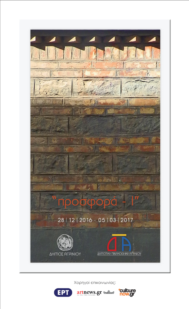 Έργα που προσέφεραν στη Δημοτική Πινακοθήκη Αγρινίου κορυφαίοι Έλληνες εικαστικοί δημιουργοί παρουσιάζονται για πρώτη φορά στο πλαίσιο της έκθεση «Προσφορά – Ι» που λαμβάνει χώρα στην ΔΠΑ μέχρι τις 5 Μαρτίου 2017.
