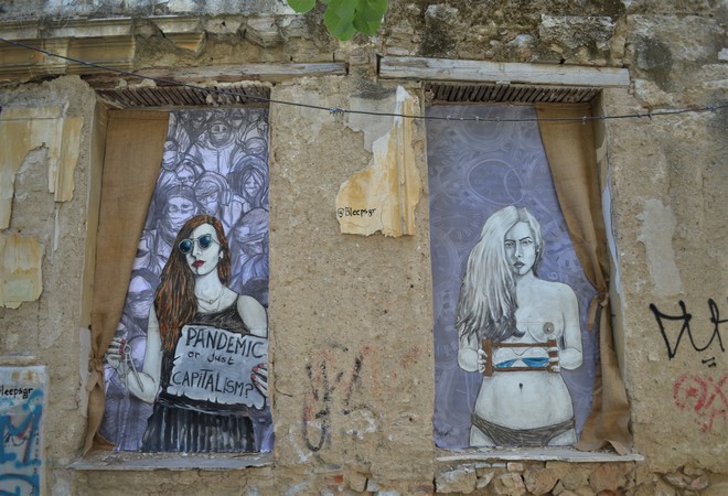 Ο γνωστός street artist Bleeps.gr εξετάζει τη διασύνδεση της πανδημίας και του καπιταλισμού μέσα από τρία νέα γκράφιτι.