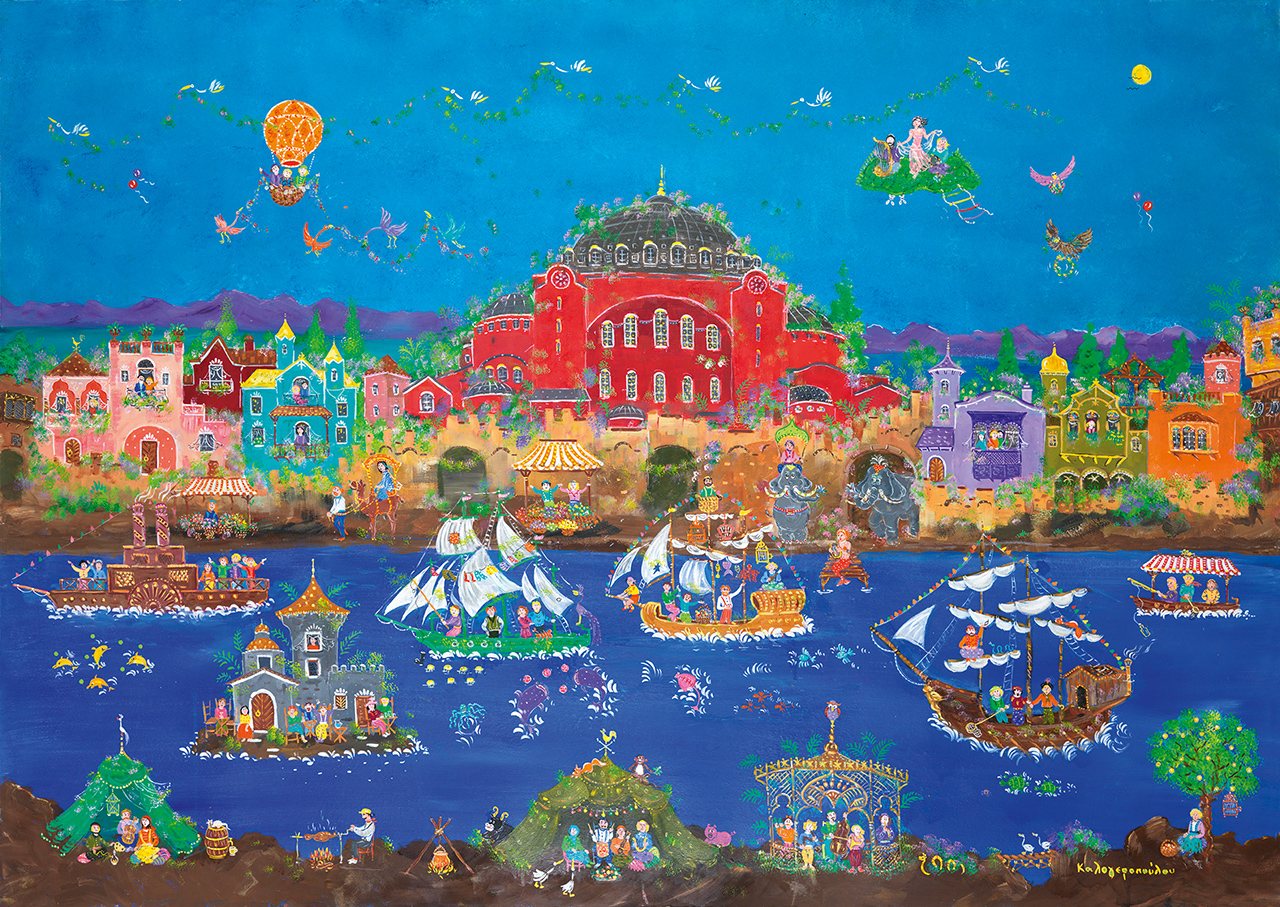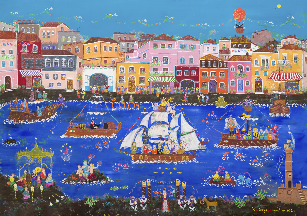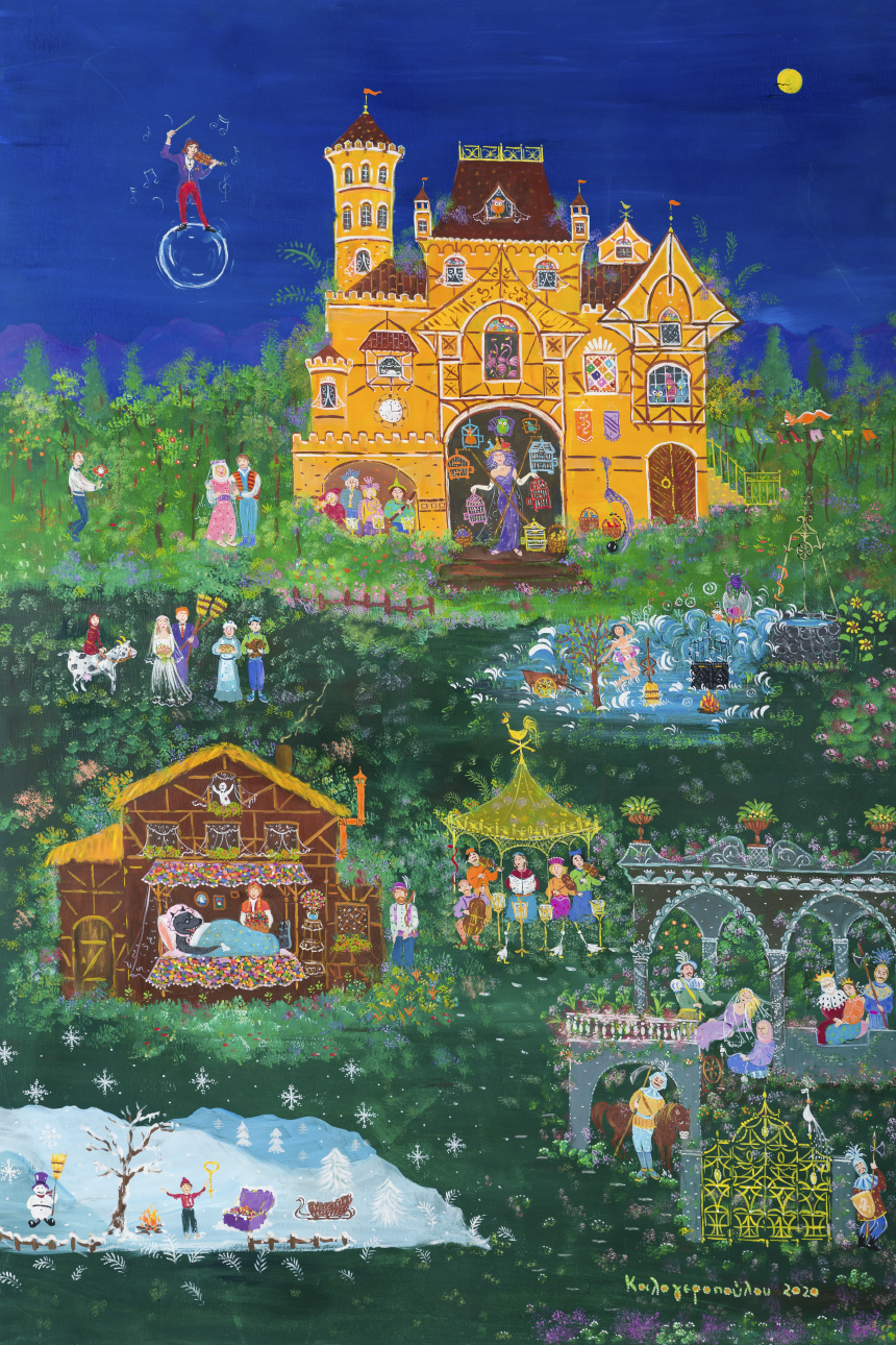Οι 78 πίνακες ζωγραφικής που συνθέτουν το παραμυθένιο, φωτεινό και αισιόδοξο σύμπαν της έκθεσης “Παναρμόνια” αφηγούνται ιστορίες εμπνευσμένες από μουσικά έργα και από λήμματα του Λεξικού της Ελληνικής Μουσικής του συζύγου της Τάκη Καλογερόπουλου. Πίσω από τα έντονα χρώματα ζωντανεύουν «λήμματα» από μια λεπτομερέστατη καταγραφή της ελληνικής μουσικής δημιουργίας, από τα οποία επιλέχθηκαν να παρουσιαστούν αυτά που ανήκουν πιθανόν «όχι στο πιο δημοφιλές κομμάτι της» αλλά ίσως «στο πιο πολύτιμο», όπως αναφέρει η ζωγράφος. Οι πίνακες μεταφέρουν τους θεατές σε σκηνές μουσικών έργων, σε θέατρα και σε μύθους. Μέσα απ’ όλη αυτή τη χρωματική και μουσική «γιορτή», τα έργα περνούν ένα μήνυμα για τον δικό μας πολιτισμό.