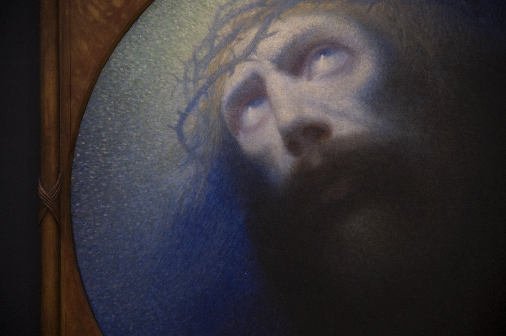 Ο εντυπωσιακός πίνακας "Χριστός-Ανθρωπότης, 1898–1900" (Λάδι σε καμβά, 200 x 200 εκ. Δωρεά Εθνικής Τράπεζας της Ελλάδας. Εθνική Πινακοθήκη-Μουσείο Αλεξάνδρου Σούτσου) "υποδέχεται" τους επισκέπτες της έκθεσης. Francesca Giaitzoglou - Watkinson
