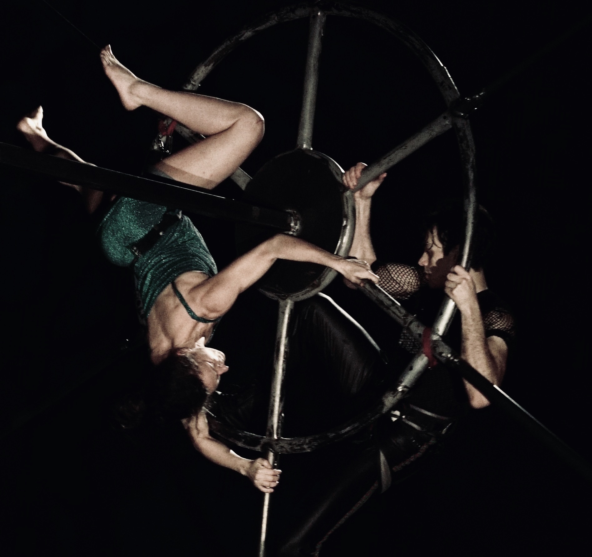 Αυτό που ξετυλίγεται μπροστά στα μάτια σου για 90 λεπτά, χωρίς μισή ανάπαυλα, είναι ένας συνδυασμός χορού, παντομίμας, και «κρεμαστών» ακροβατικών σε κάθε δυνατό σημείο του (μεγάλου, κυρίως) τροχού. Αλλά τρυπώνει στην παράσταση και λίγο από τραγούδι και πρόζα –ειδικά η δεύτερη ευτυχεί με τον πολυτάλαντο Νίκο Μάνεση να αραδιάζει στο μικρόφωνο φράσεις-εμμονή, μουρμουρητά, μάντρα για τον χρόνο που τρέχει, ή βοκαλισμούς μεταξύ beat box και ψαλμού. Θαυμάσια άρθρωση και πειστικό συναίσθημα.