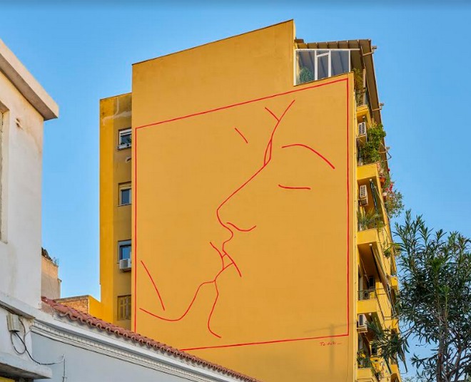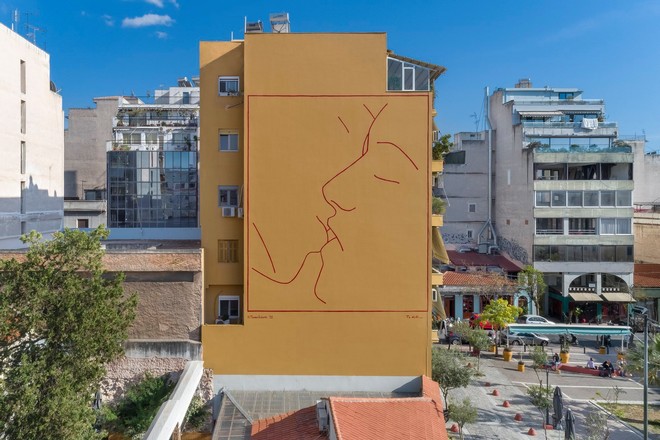 Αδρές γραμμές πάνω σε φόντο ώχρας, δυο πρόσωπα ενωμένα στο στόμα, χωρίς (ευτυχώς) να προσδιορίζεται το φύλο των δυο «φιλητών», το εν λόγω έργο ήρθε για να μείνει. Να γίνει τοπόσημο πάνω σε έναν τοίχο της πόλης, να υπενθυμίζει νυχθημερόν στους διαβάτες τα οφέλη της αγκαλιάς, της εγγύτητας, του μοιράσματος που φέρνει ένα φιλί. Θα το ακολουθήσουν κι άλλες τέτοιες μεγάλων διαστάσεων τοιχογραφίες, στο πλαίσιο μιας νέας συνεργασίας του Ιδρύματος Ωνάση με τον Οργανισμό Πολιτισμού Αθλητισμού και Νεολαίας του Δήμου Αθηναίων, που σκοπό έχει ακριβώς αυτό: να μετατρέψει τοίχους της πόλης σε υπερμεγέθεις ζωγραφικούς πίνακες.