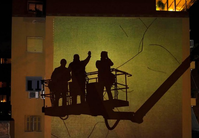 Η ιστορία πάει ως εξής: Ο επιμελητής της έκθεσης που κάνω στην Δημοτική Πινακοθήκη Αθηνών, ο Χριστόφορος Μαρίνος, όταν μου πρότεινε να κάνουμε την έκθεση και γνωρίζοντας την δουλειά μου, μου είπε «θα κάνεις, όμως, και μια τοιχογραφία». Φαντάστηκα, χωρίς να το ‘χουμε συζητήσει, ότι εννοούσε να κάνω μια τοιχογραφία μέσα στην πινακοθήκη. Εγώ, λοιπόν, του είπα, θα κάνω μια τοιχογραφία αλλά θα την κάνω έξω. «Πολύ ωραία,» μου είπε. Στην συνέχεια, μπήκε στο παιχνίδι η Στέγη [Γραμμάτων και Τεχνών του Ιδρύματος Ωνάση], αφού προφανώς μίλησε ο Χριστόφορος με τους ανθρώπους της, εκείνοι ενθουσιάστηκαν, τους άρεσε πολύ η ιδέα, και είπαν «πες στον Ηλία ότι αναλαμβάνουμε τα έξοδα.» Και κάπως έτσι, έγινε. Και πρέπει να πω, πως πρόκειται για έργο που χωρίς την σπουδαία συνεργασία πολλών και διαφορετικών παραγόντων δεν θα μπορούσε να είχε γίνει. Εγώ, έκανα το καλύτερο που μπορούσα, αλλά μόνος μου δεν θα μπορούσα να το είχα φτιάξει.