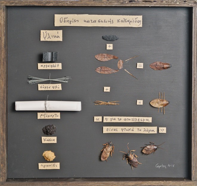Λέει η εικαστικός και επιμελήτρια της έκθεσης Μαρία Παπαδημητρίου για τον Capten: «Μας ενθουσιάζει η παιγνιώδης διάθεση του καλλιτέχνη αλλά και μας προβληματίζει αν αναλογιστούμε τη σχέση μας με τη φύση και την τεράστια κλιματική αλλαγή. Στα έργα του οι κατσαρίδες παίρνουν ιερατικές διαστάσεις είτε είναι επιθετικές σαν στρατός σε εξόρμηση είτε είναι τεράστιες και εμφατικές. Παράλληλα, παρουσιάζει μια σειρά από επίχρυσες κατσαρίδες, κόσμημα φτιαγμένο με πολύ μαεστρία, σήμα κατατεθέν του έργου του!».